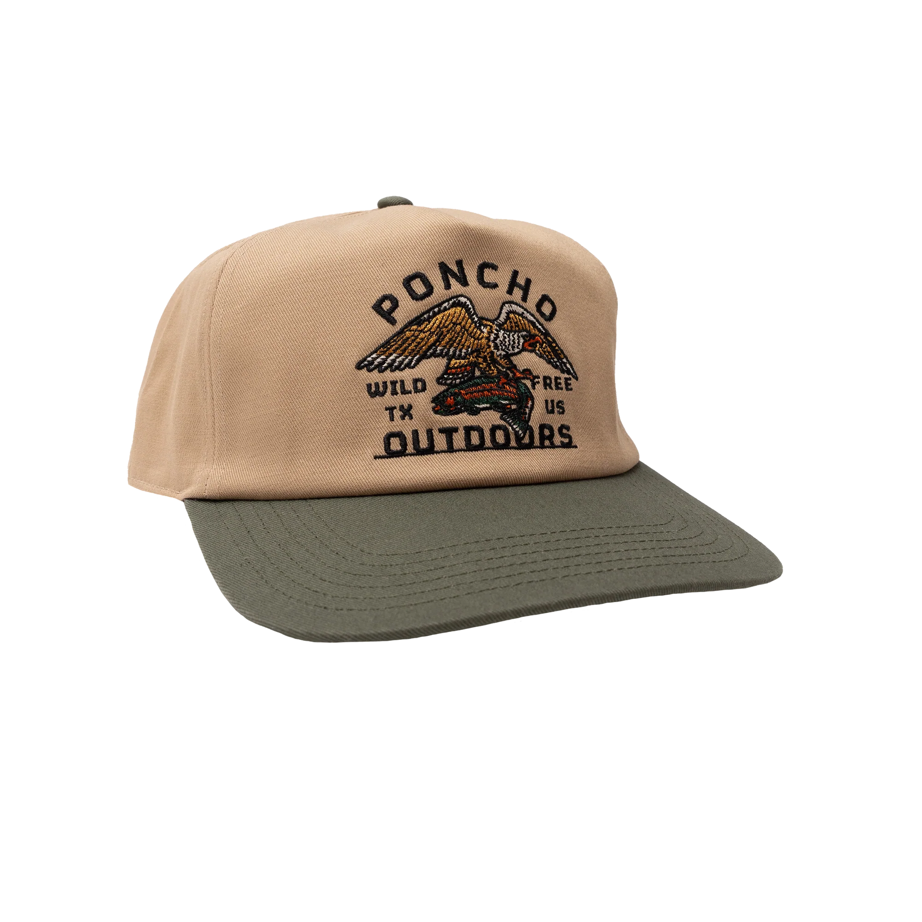Vintage cotton hat with a snapback closure. Embroidered with the eagle and trout logo.